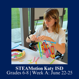 Dates: 06/22/2026 - 06/25/2026 Times: M -TH , 9:00 AM - 3:00 PM Location: Katy ISD, Robert R. Shaw Center for STEM 1730 Katyland Dr, Katy, TX 77493 Grades: 6th-8th (current 2025-2026 school year) Price: $449/week* Lunch is not included. Participants will need to bring their own lunch, snacks, and a water bottle each day. * A $3.00 administrative processing fee will be applied to your registration upon checkout. *Discounts and refunds cannot be issued for partial attendance in the program. STEAMotion Katy Week A for Grades 6-8 (current 2025-2026 school year) at Katy ISD is a dynamic 4-day, summer academy crafted by the Rice Office of STEM Engagement in partnership with various districts. This program is designed to ignite young minds and bodies, offering a unique blend of enriching STEAM (Science, Technology, Engineering, Arts, and Mathematics) activities. Students embark on an exciting journey exploring physics, mathematics, computer science, and engineering through hands-on activities in the classroom and in motion. Each day includes immersive STEAM projects and engaging activities, fostering teamwork and collaboration. Led by experienced school district staff, our academies also feature guest speakers and special learning opportunities, ensuring a rich and memorable experience for all participants. Right click here to open a new window and apply for scholarships.