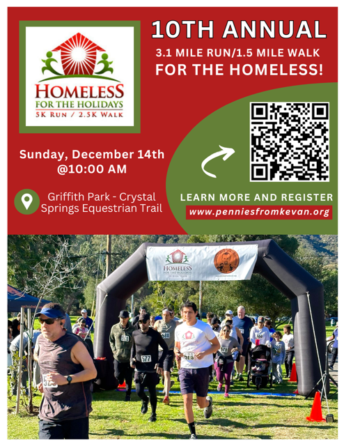 Chip-timed 5K (3.1 mile) Run / Self-paced 2.5K (1.5 mile) Walk in beautiful Griffith Park, raising funds for Homeless and Food/Housing insecure adults, children and families in the Los Angeles area.