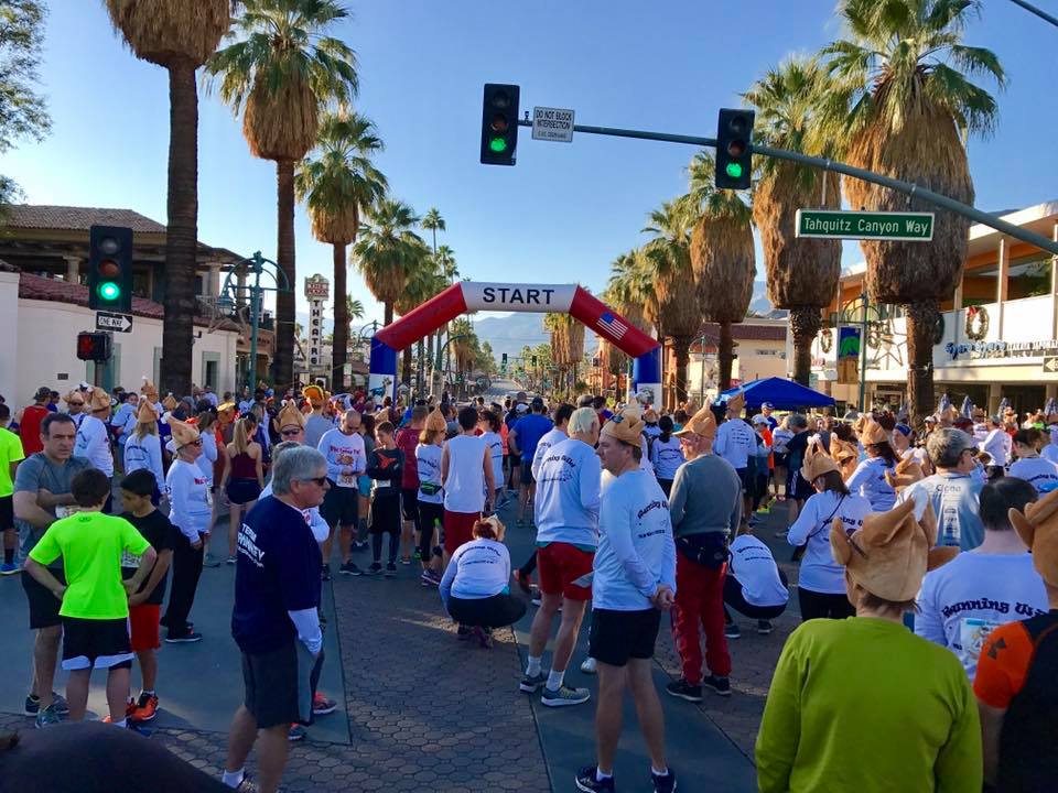 The Palm Springs TURKEY TROT 5K takes place on Thanksgiving morning, Thursday, November 27th, 2025. The event will start at 8:00 am at the corner of Tahquitz & Palm Canyon, Palm Springs, CA 92262