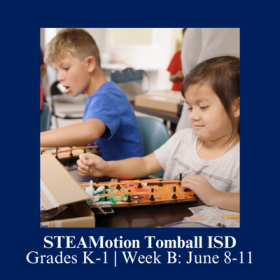 Dates: WEEK B, 06/08/2026 - 06/11/2026 Times: M -TH , 9:00 AM - 3:00 PM Location: Tomball ISD-Location TBA Grades: K-1 (current 2025-2026 school year) Price: $449/week* - Lunch is not included. - Student lunch accounts at Tomball ISD may be used to purchase a daily lunch for STEAMotion at a Tomball ISD cafeteria. - If not using a student lunch account, participants at this location will need to bring their own lunch daily. - All participants will need to bring their own snacks and a water bottle each day. * A $3.00 administrative processing fee will be applied to your registration upon checkout. *Discounts and refunds cannot be issued for partial attendance in the program. STEAMotion Tomball Week B for Grades K-1 (current 2025-2026 school year) at Tomball ISD is a dynamic 4-day, summer academy crafted by the Rice Office of STEM Engagement in partnership with various districts. This program is designed to ignite young minds and bodies, offering a unique blend of enriching STEAM (Science, Technology, Engineering, Arts, and Mathematics) activities. Students embark on an exciting journey exploring physics, mathematics, computer science, and engineering through hands-on activities in the classroom and in motion. Each day includes immersive STEAM projects and engaging activities, fostering teamwork and collaboration. Led by experienced school district staff, our academies also feature guest speakers and special learning opportunities, ensuring a rich and memorable experience for all participants. Right click here to open a new window and apply for scholarships.